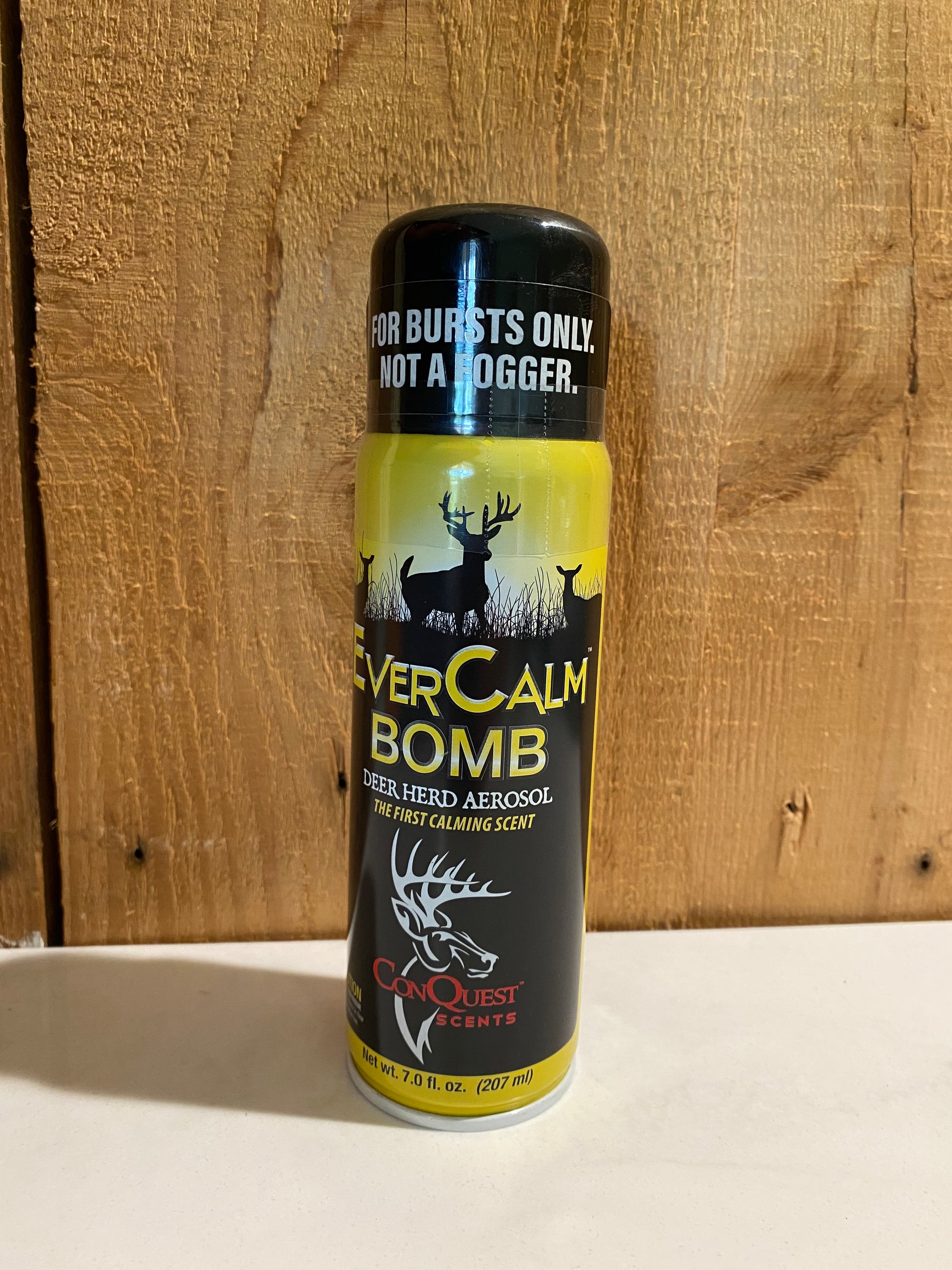EverCalm ConQuest Scents #1 Deer Scent is now available in an Aerosol Bomb! It can be dispensed in bursts, which allows you to control how much scent is released at one time. Or, it can be dispensed all at one time, filling the entire hunting area with the EverCalm Scent. The nozzle atomizes the EverCalm as it is released into the hunting area. Atomizing allows the EverCalm to stick to vegetation in the environment, so you can leave an active scent trail. Features: Allows you to control how much scent is released. Sticks to vegetation. Leaves an active scent trail. A natural scent barrier between the hunter and the animal. Scents can be mixed.