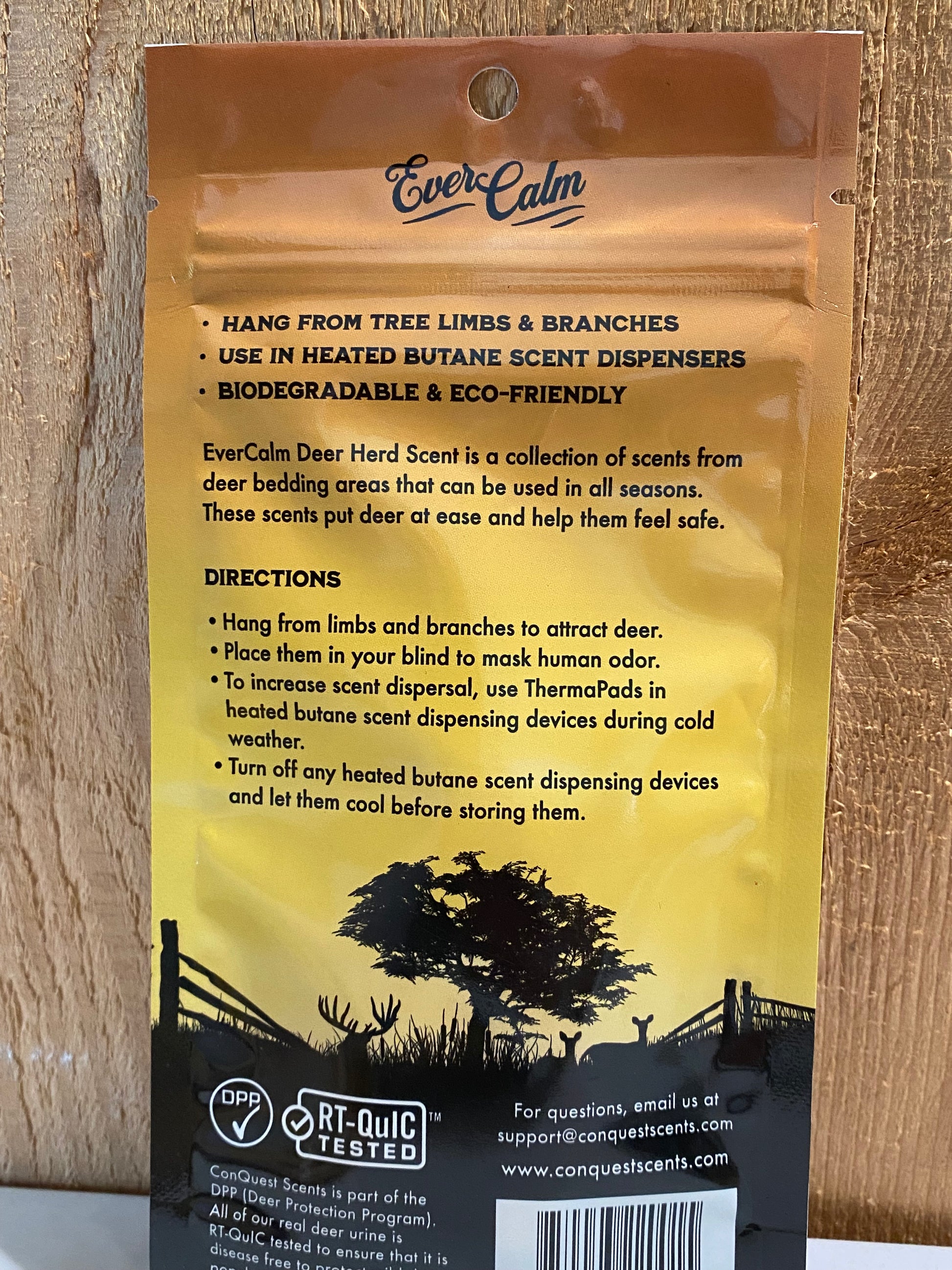 EverCalm Therma Pads are scented with our popular EverCalm scent. EverCalm Deer Herd Scent is a collection of scents from deer bedding areas that can be used in all seasons. These scents put deer at ease and help them feel safe.