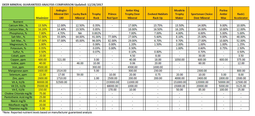 Real World’s Maximizer Deer Mineral was developed after more than 20 years of extensive research with both captive whitetails as well as wild deer. Unlike other salt-dominated products which offer very little nutritional benefit to deer, Maximizer Mineral for Deer is specifically formulated with over 20 micro and macro-nutrients, many in precise proportion to each other.